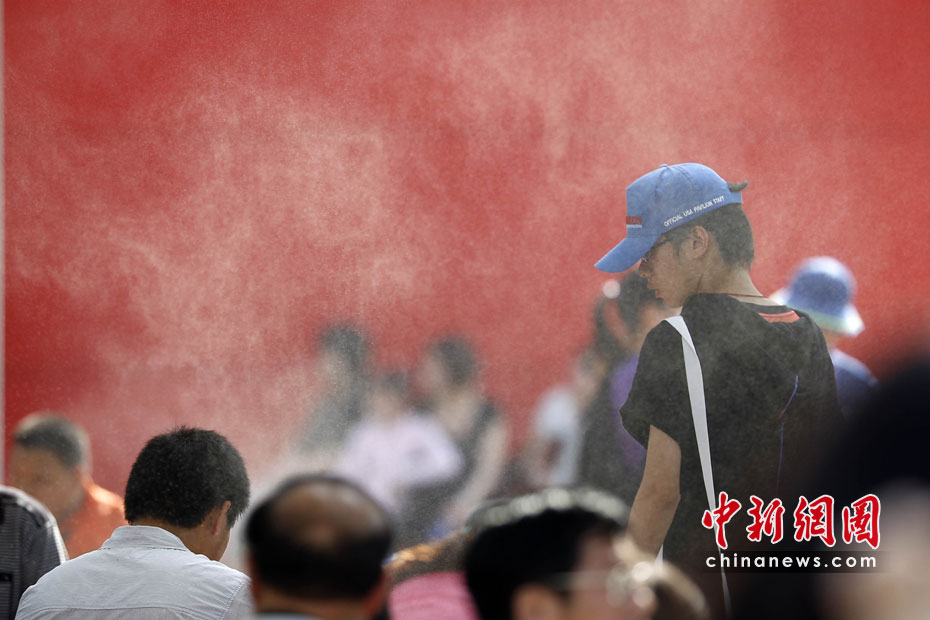 2010年5月2日,上海世博園區(qū)啟動各項控溫降溫設施應對高溫。圖為游客休息區(qū)內啟動噴霧降溫系統(tǒng)。中新社記者 盛佳鵬 攝