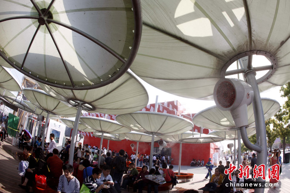 2010年5月2日,上海世博園區(qū)啟動(dòng)各項(xiàng)控溫降溫設(shè)施應(yīng)對(duì)高溫。圖為游客休息區(qū)內(nèi)啟動(dòng)噴霧降溫系統(tǒng)。中新社記者 盛佳鵬 攝