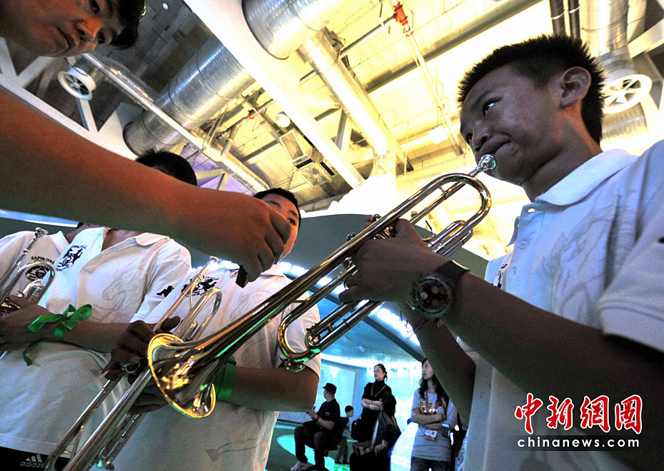 5月2日清晨,來自玉樹地震災(zāi)區(qū)結(jié)古鎮(zhèn)的藏族小樂手巴東珠,含著姐姐在地震中不幸遇難的悲痛心情,與小白楊中學(xué)生管弦樂團來到上海世博會,為中國青海館觀眾獻(xiàn)上一曲《在那遙遠(yuǎn)的地方》。他悲歡交融的情懷和演藝,感動全場。巴東珠之前還是青海省人民醫(yī)院為地震傷員做藏語翻譯的志愿者。中新社記者 賈國榮 攝