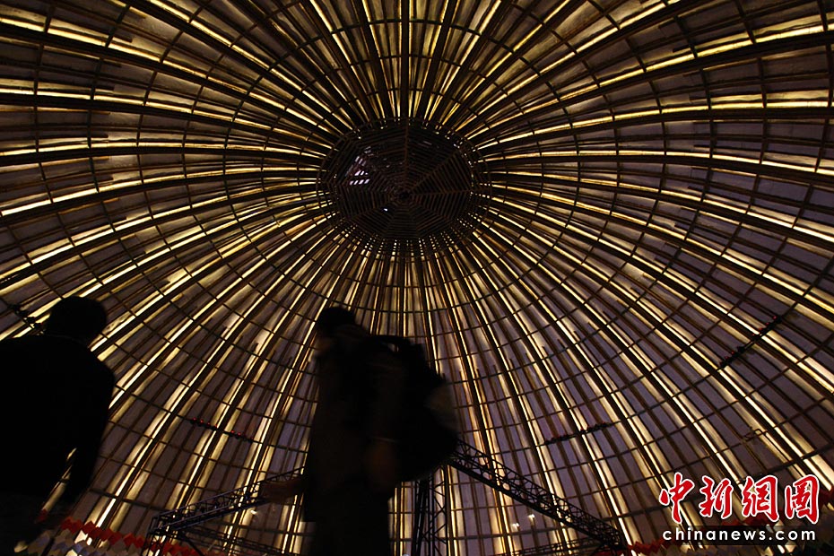 5月2日,上海世博會(huì)是第一個(gè)正式提出“低碳世博”理念的世博會(huì),圍繞著這樣的理念,上海世博園區(qū)內(nèi)的低碳元素比比皆是。圖為印度館內(nèi)竹制的世界最大穹頂,這個(gè)竹制穹頂上方是小型風(fēng)力發(fā)電裝置和太陽能電池板,為整個(gè)場(chǎng)館提供綠色清潔能源。中新社發(fā) 湯彥俊 攝