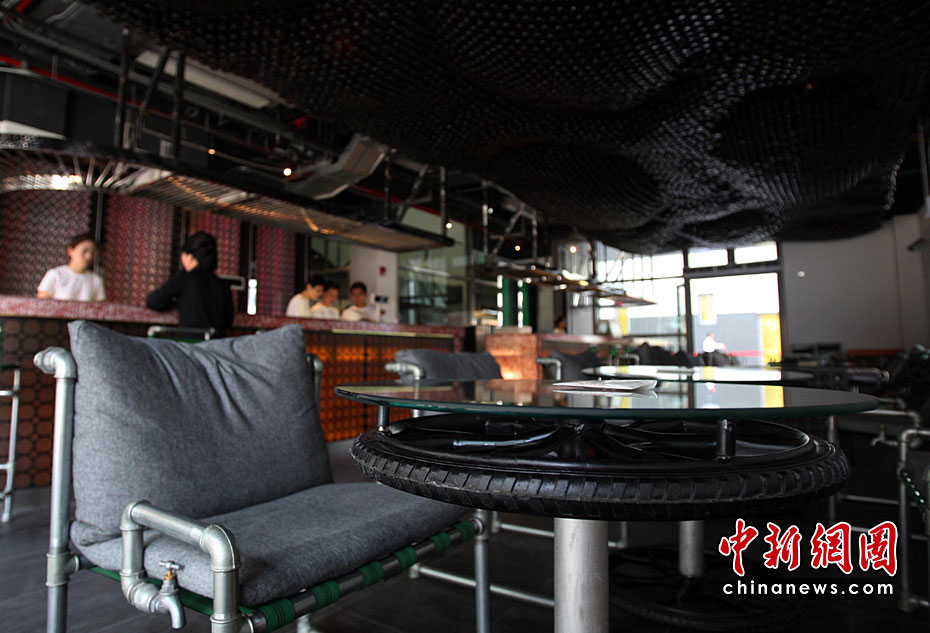 5月2日,上海世博會(huì)是第一個(gè)正式提出“低碳世博”理念的世博會(huì),圍繞著這樣的理念,上海世博園區(qū)內(nèi)的低碳元素比比皆是。圖為世博倫敦零碳館內(nèi)由廢舊輪胎、水管、瓶子組成的“零碳酒吧”。中新社發(fā) 湯彥俊 攝