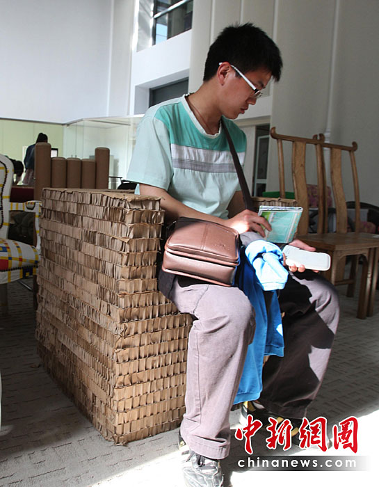 5月2日,上海世博會是第一個正式提出“低碳世博”理念的世博會,圍繞著這樣的理念,上海世博園區(qū)內(nèi)的低碳元素比比皆是。圖為世博倫敦零碳館內(nèi)由廢舊紙箱做成的沙發(fā)。中新社發(fā) 湯彥俊 攝