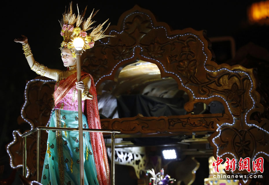 5月2日晚,由一輛輛充滿異域風(fēng)情的花車和身著盛裝的表演者組成的“歡樂盛裝大巡游”在世博園區(qū)舉行。中新網(wǎng)記者 盛佳鵬 攝