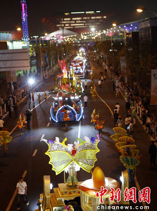 5月2日晚,由一輛輛充滿異域風情的花車和身著盛裝的表演者組成的“歡樂盛裝大巡游”在世博園區(qū)舉行。中新網(wǎng)記者 盛佳鵬 攝