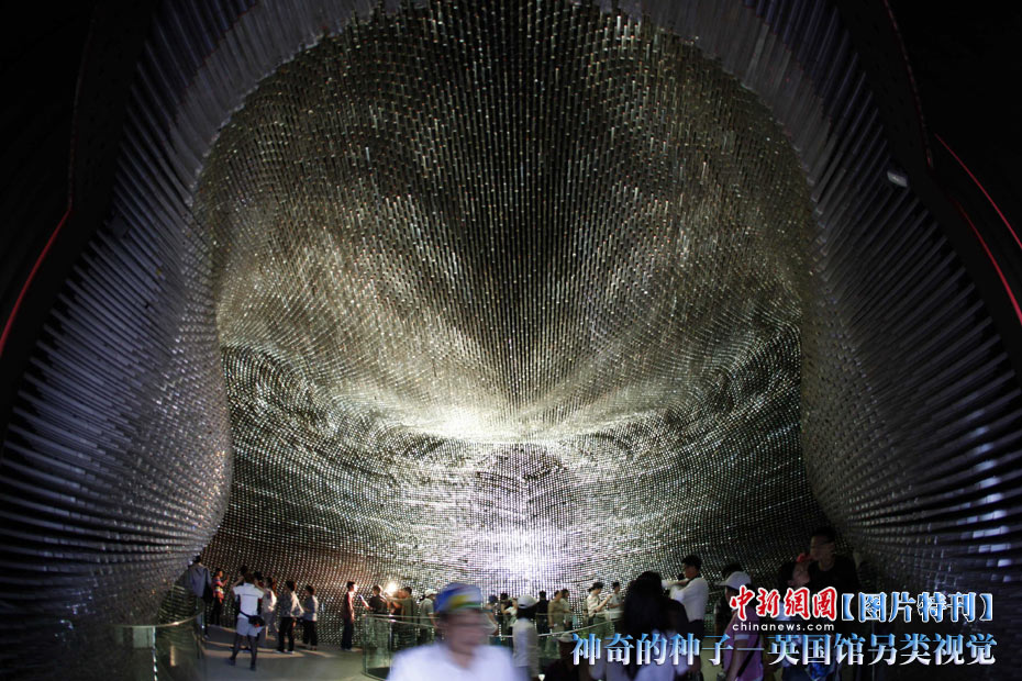 上海世博園開園才數(shù)日,自號(hào)“種子圣殿”的英國(guó)館已成人氣最旺場(chǎng)館之一。該館由6萬根亞克力桿巧妙構(gòu)成,隨風(fēng)搖動(dòng),頗為新奇。其每根桿子里都含有植物種子。中新社記者 盛佳鵬 攝