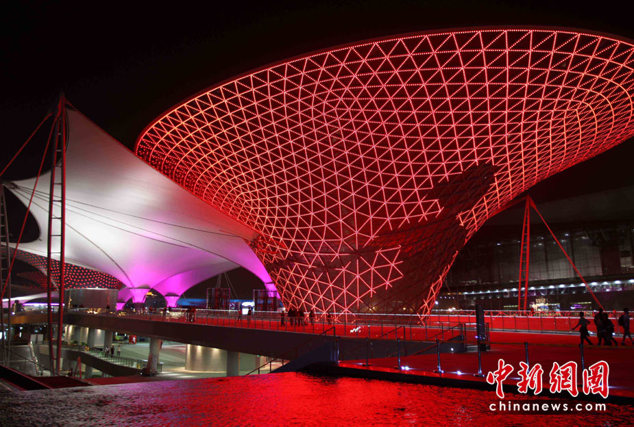 夜幕下的上海世博園區(qū)處處流露光華與璀璨,世博軸上的“陽光谷”成為一個個流光溢彩的“夜光杯”,以不同色調(diào)交織成流動的光影旋律,給游客們帶來難以忘懷的感受。中新社發(fā) 宗金柱 攝