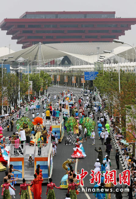 5月4日,世博會北京周花車巡游隊伍向中國館行進。當(dāng)日,世博會北京周開幕。 中新社發(fā) 蘇丹 攝
