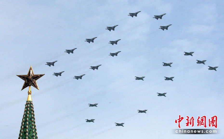 當(dāng)?shù)貢r間5月4日,在俄羅斯首都莫斯科,參加彩排的戰(zhàn)機(jī)編隊(duì)飛過紅場上空。俄羅斯將于5月9日隆重紀(jì)念衛(wèi)國戰(zhàn)爭勝利65周年。圖片來源:中國新聞網(wǎng)