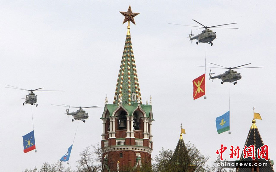 當(dāng)?shù)貢r(shí)間5月4日,在俄羅斯首都莫斯科,參加彩排的戰(zhàn)機(jī)編隊(duì)飛過紅場(chǎng)上空。俄羅斯將于5月9日隆重紀(jì)念衛(wèi)國(guó)戰(zhàn)爭(zhēng)勝利65周年。圖片來源:中國(guó)新聞網(wǎng)