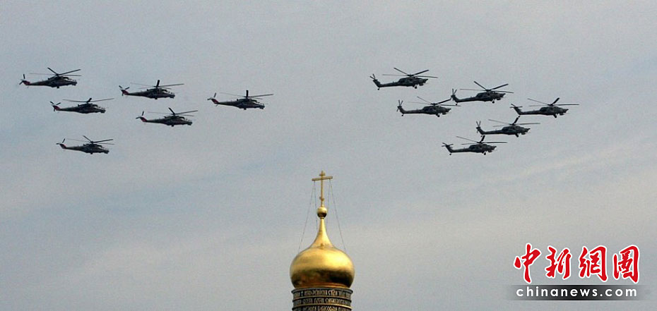 當(dāng)?shù)貢r間5月4日,在俄羅斯首都莫斯科,參加彩排的戰(zhàn)機(jī)編隊飛過紅場上空。俄羅斯將于5月9日隆重紀(jì)念衛(wèi)國戰(zhàn)爭勝利65周年。圖片來源:中國新聞網(wǎng)