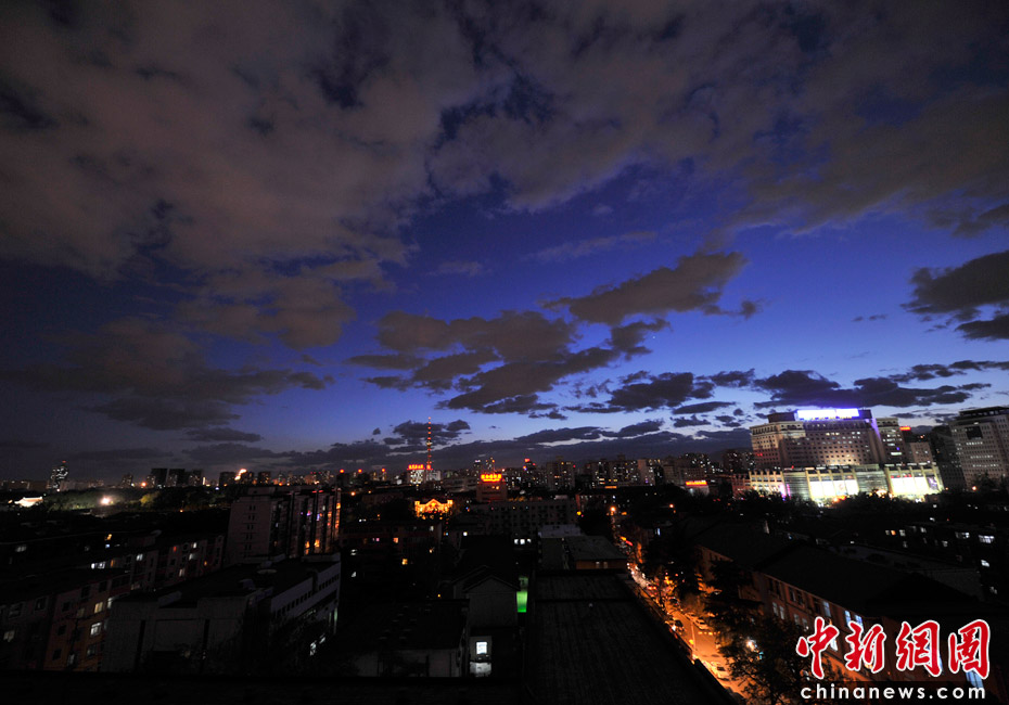 5月5日立夏,京城降雨今晨剛剛結束,霧氣伺機又起。傍晚時分,隨著四級北風的到來,京城天氣逐漸轉晴,霧氣慢慢消散天空彤云密布夜色瑰麗。中新網(wǎng)記者 金碩 攝