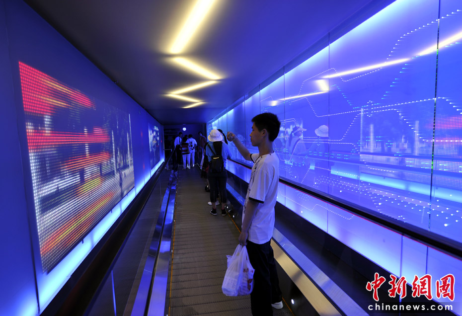 進(jìn)入互動(dòng)區(qū)的滾梯兩側(cè)是炫麗的屏幕,頭頂上方還不時(shí)滑過一道道“閃電”。中新網(wǎng)記者 王紅綱 攝