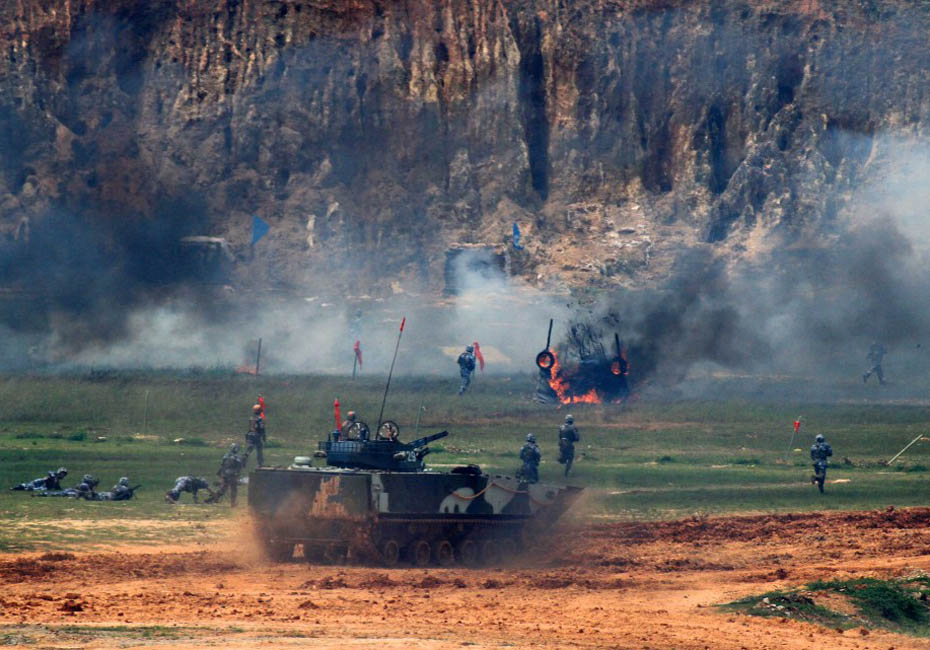 陸戰(zhàn)隊(duì)在訓(xùn)練場進(jìn)行登陸作戰(zhàn)實(shí)兵實(shí)彈演練。圖片來源:新華網(wǎng) 查春明攝