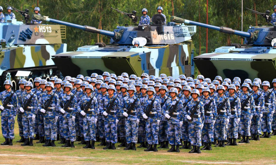 海軍陸戰(zhàn)隊(duì)員和新型裝備接受檢閱。圖片來源:新華網(wǎng) 查春明攝