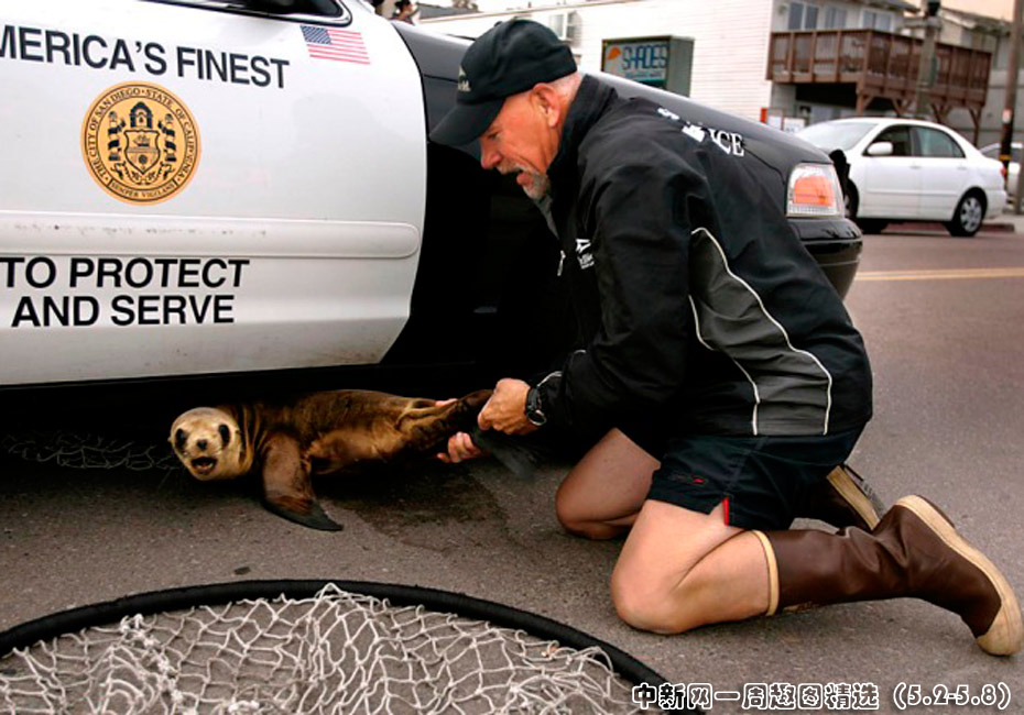 5月5日,在加利福尼亞州,動物護(hù)理專家羅賓森把一頭小海豹從圣地亞哥警車下拖出。小海豹之前在另一輛車下被發(fā)現(xiàn),看到警察要捉它就躲到了這輛警車下。圖片來源:中國新聞網(wǎng)>>點擊觀看詳細(xì)內(nèi)容