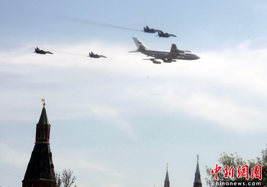 5月9日,俄羅斯在莫斯科紅場舉行盛大的閱兵式,慶祝衛(wèi)國戰(zhàn)爭勝利65周年。莫斯科時間5月9日上午10點(北京時間9日下午2點)許,閱兵式正式開始。圖為空中梯隊飛越紅場上空。中新網(wǎng)記者 張朔 攝