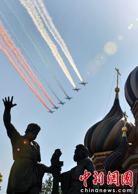 5月9日,俄羅斯在莫斯科紅場(chǎng)舉行盛大的閱兵式,慶祝衛(wèi)國戰(zhàn)爭(zhēng)勝利65周年。莫斯科時(shí)間5月9日上午10點(diǎn)(北京時(shí)間9日下午2點(diǎn))許,閱兵式正式開始。圖為空中梯隊(duì)飛越紅場(chǎng)上空。