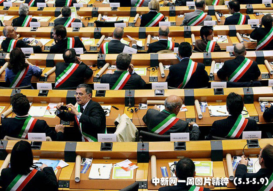 5月4日周二,在布魯塞爾召開(kāi)的歐洲議會(huì)市長(zhǎng)會(huì)議上,一名市長(zhǎng)為同事們拍照。