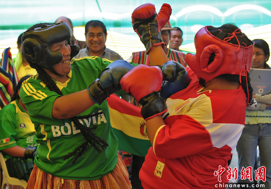 5月13日,秘魯利馬高地舉辦的傳統(tǒng)食品博覽會上,兩名安第斯農(nóng)民婦女穿著象征秘魯和玻利維亞的裙子同臺搏擊妙趣橫生。圖片來源:中國新聞網(wǎng)