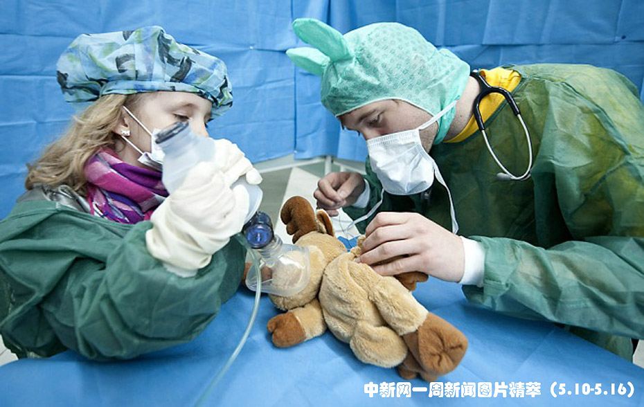 周一(10日),在德國(guó)柏林的菲爾紹臨床中心的“泰迪熊醫(yī)院”,萊奧尼(Leonie, 左)和一名醫(yī)科學(xué)生在為一個(gè)毛茸玩具動(dòng)手術(shù)。這家醫(yī)院旨在減輕孩子們對(duì)醫(yī)生和醫(yī)療設(shè)備的恐懼感。