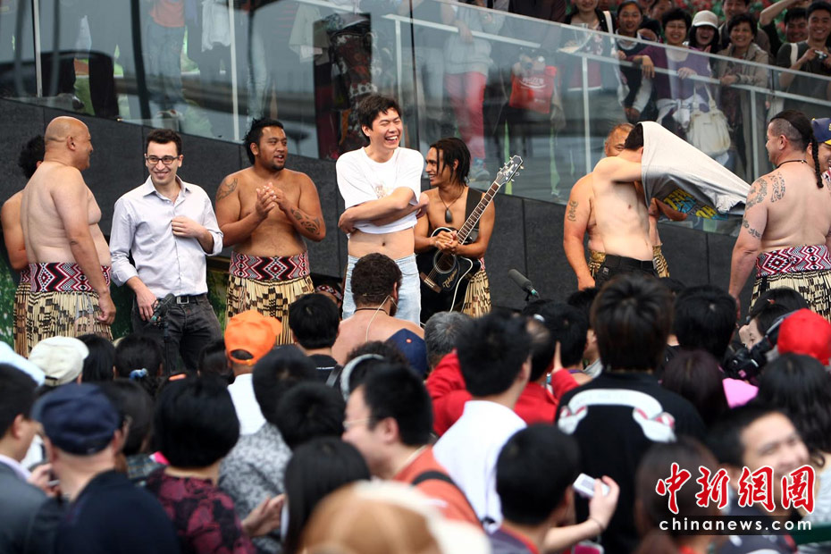 5月初,游客在上海世博會(huì)新西蘭館前赤膊上陣學(xué)跳毛利舞。中新社記者 杜洋 攝