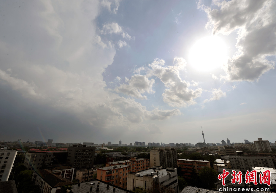 5月18日16時許,伴隨陣陣雷聲京城突降大雨,降雨過后東部天空依然籠罩著烏云,而西邊卻已放晴。中新網(wǎng)記者 金碩 攝