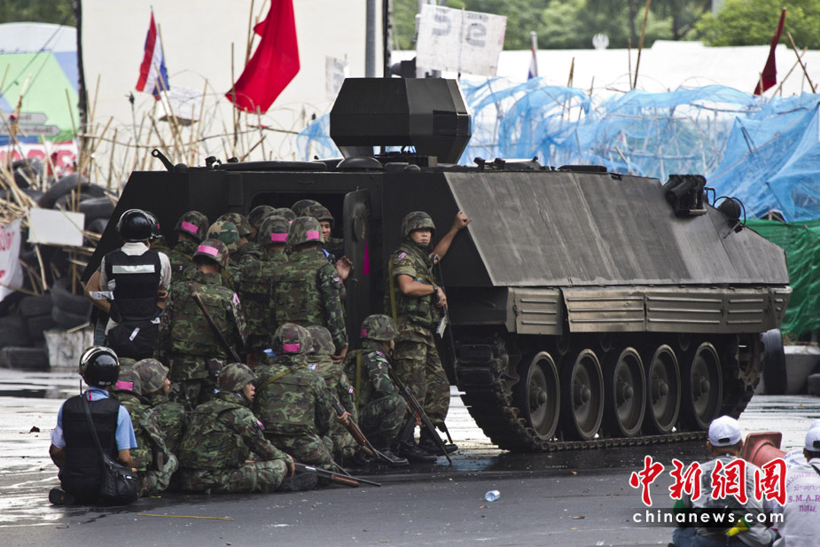 19日清晨,數(shù)百名軍警在武裝車輛的掩護(hù)下向反政府示威者在曼谷的大本營聚集。自上周四紅衫軍與政府在曼谷爆發(fā)沖突以來,已經(jīng)導(dǎo)致39人死亡,數(shù)百人受傷。