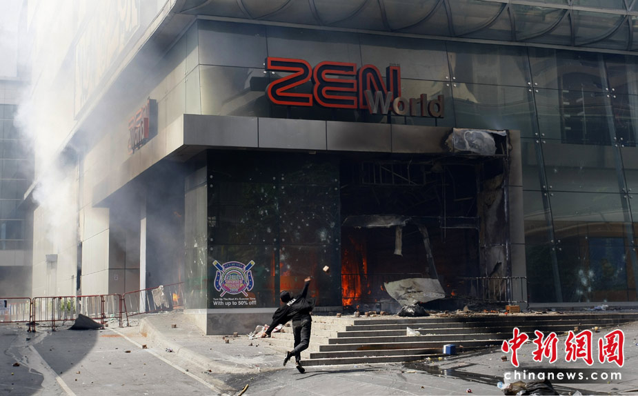 泰國軍方19日清場,希望將陷入內(nèi)戰(zhàn)邊緣的曼谷拯救出來,雖然紅衫軍節(jié)節(jié)敗退,但有激進(jìn)分子未肯罷休,四處放火,電視臺、股票交易所、電力公司、幾間銀行、商場戲院都遭殃,商場和便利店亦成為搶掠目標(biāo)。據(jù)報(bào)曼谷有27處地方起火,泰國最大的商場Central World、Siam Square和Siam Paragon三大購物中心被縱火,其中Central World燒通頂,據(jù)報(bào)快將倒塌。