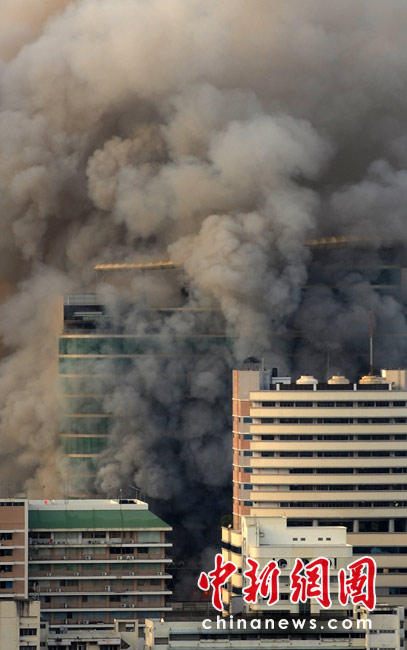 泰國(guó)軍方19日清場(chǎng),希望將陷入內(nèi)戰(zhàn)邊緣的曼谷拯救出來(lái),雖然紅衫軍節(jié)節(jié)敗退,但有激進(jìn)分子未肯罷休,四處放火,電視臺(tái)、股票交易所、電力公司、幾間銀行、商場(chǎng)戲院都遭殃,商場(chǎng)和便利店亦成為搶掠目標(biāo)。據(jù)報(bào)曼谷有27處地方起火,泰國(guó)最大的商場(chǎng)Central World、Siam Square和Siam Paragon三大購(gòu)物中心被縱火,其中Central World燒通頂,據(jù)報(bào)快將倒塌。