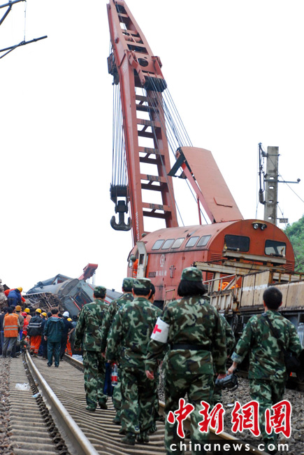5月23日凌晨2時10分,滬昆鐵路江西東鄉(xiāng)段發(fā)生一起客運列車脫線事故,截至上午9時,已有10人遇難,車內乘客全部被轉移,現場救援工作正在緊張進行。事故發(fā)生后,南京軍區(qū)武警,江西省消防、交警,中鐵電氣化局、醫(yī)療等部門立即組織近萬名人員參與搶險救災,目前現場已有10余臺挖土機和吊車參與救援。中新社發(fā) 劉占昆 攝