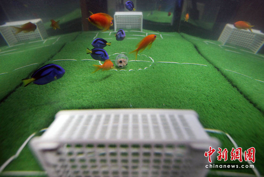 5月23日,日本橫濱八景島海洋世界水族館中,一群魚兒在“踢足球”,藍(lán)色魚代表日本隊(duì),橘色魚代表荷蘭隊(duì)。在2010年南非“世界杯”上,日本將迎戰(zhàn)荷蘭隊(duì)。