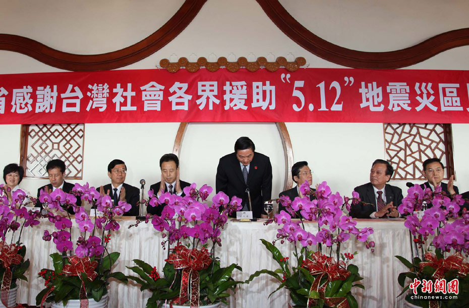 5月24日下午,“四川省感謝臺灣社會各界援助‘5.12’地震災(zāi)區(qū)見面會”在臺北圓山飯店舉行,首度訪臺的中共四川省委書記劉奇葆于致辭時,兩度鞠躬感謝臺灣同胞積極援助四川災(zāi)區(qū),展現(xiàn)出血濃于水的同胞大愛。 中新網(wǎng)記者董會峰攝