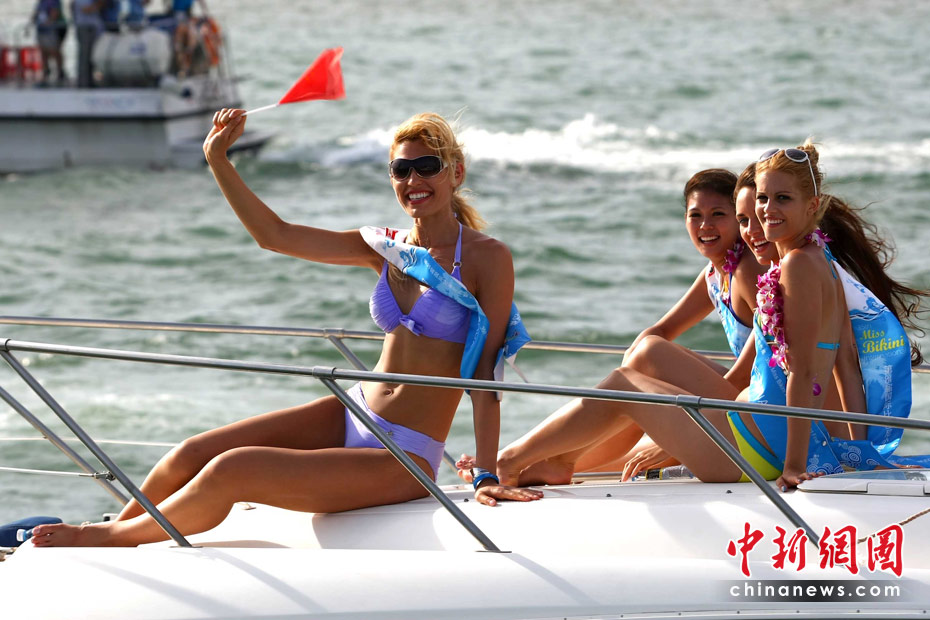 5月23日,全球64位比基尼佳麗們參加了三亞“清涼一夏 文化三亞”夏季旅游促銷活動的啟動儀式及系列主題活動,與三亞市民和游客親密接觸,跳起了歡快的竹竿舞,并乘豪華游艇暢游三亞。中新社記者 富田 攝