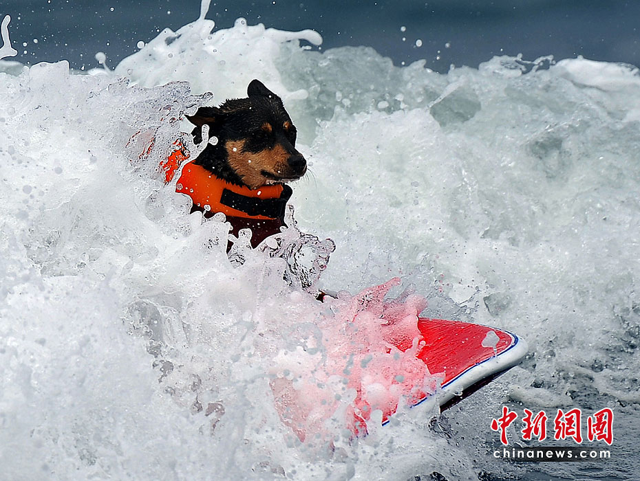 5月22日,美國加利福尼亞州圣迭戈舉行了一場妙趣橫生的狗狗沖浪比賽。圖片來源:中國新聞網(wǎng)