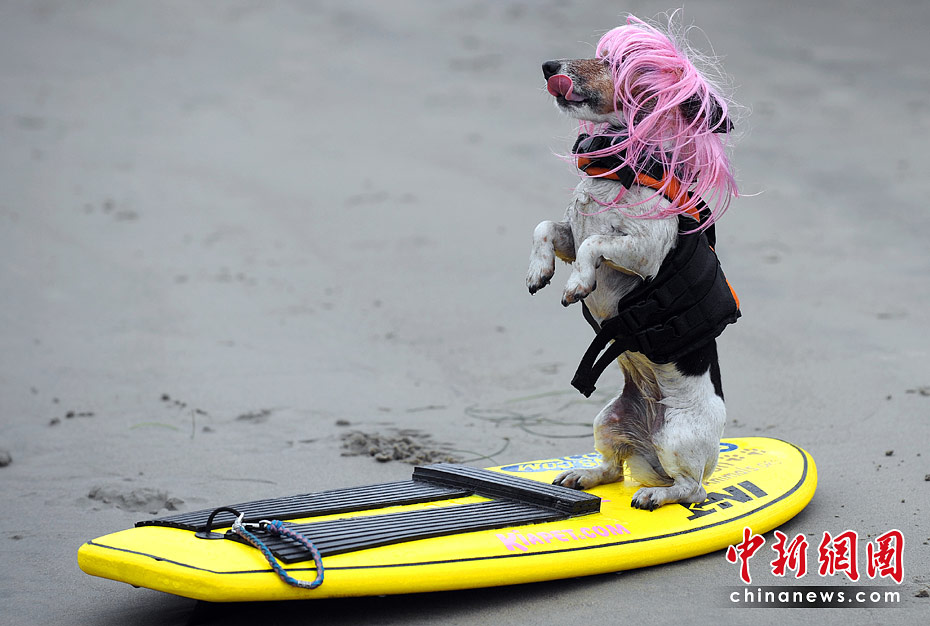 5月22日,美國加利福尼亞州圣迭戈舉行了一場妙趣橫生的狗狗沖浪比賽。圖片來源:中國新聞網(wǎng)