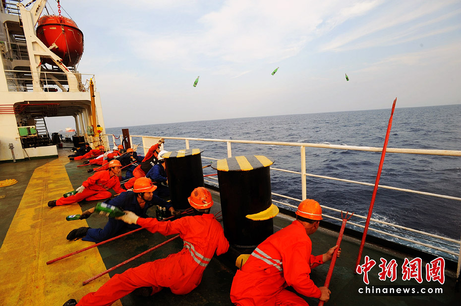 有特戰(zhàn)隊員在身邊,增強(qiáng)了船員反海盜信心。圖為演練時,船員進(jìn)行投擲啤酒瓶訓(xùn)練。江山 攝