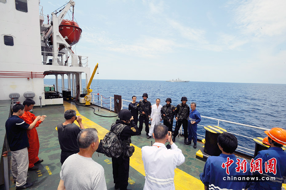 離別時(shí),船員紛紛與特戰(zhàn)隊(duì)員以“廣州”艦為背景合影留念,以此表達(dá)對(duì)護(hù)航官兵的敬意和作為中國(guó)船員的自豪感。江山 攝