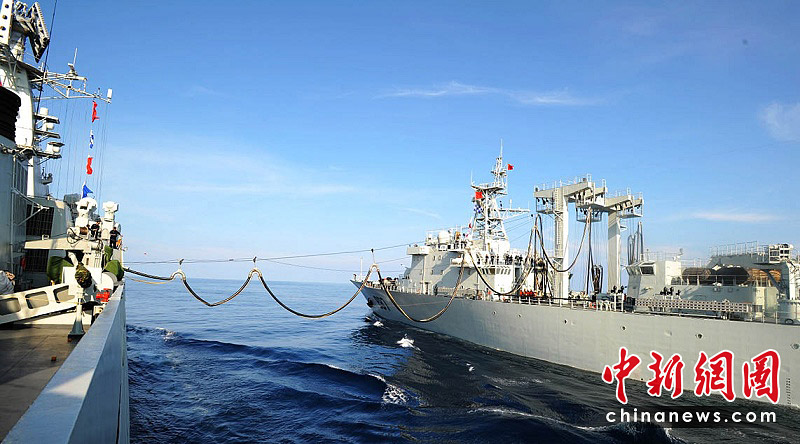 3月9日上午,第五批護航編隊在印度洋進行了首次海上補給!拔⑸胶本C合補給艦對“廣州”號導彈驅(qū)逐艦進行了橫向的液貨補給。江山 攝