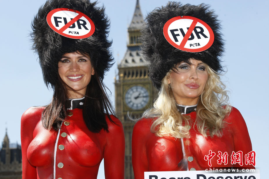 5月24日,倫敦,兩位打扮成英國(guó)女王守衛(wèi)模樣的靚模在威斯敏斯特大橋上抗議女王守衛(wèi)頭戴熊皮制作的帽子,倡議保護(hù)動(dòng)物。