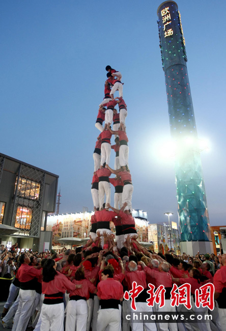 5月25日,西班牙“人塔”在上海世博會歐洲廣場上逐層壘起,為西班牙加泰羅尼亞周助興!隘B人塔”(HUMAN WALL),是西班牙加泰羅尼亞地區(qū)最具傳統特色的民俗節(jié)慶活動,起源于18世紀末加泰羅尼亞南部的巴爾斯。后來,“疊人塔”活動逐漸在加泰羅尼亞其他地區(qū)流行,進而風靡整個西班牙。中新社發(fā) 杜洋 攝