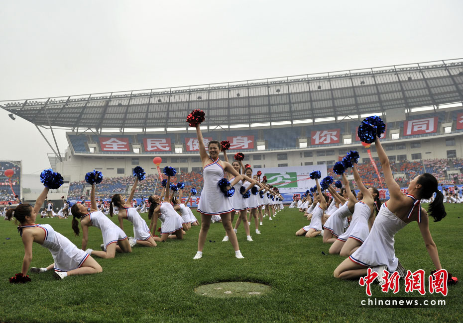 中央國家機關(guān)第三屆職工運動會今日在北京國家奧林匹克體育中心正式開幕。90多個中央國家機關(guān)部門參加開幕式,中共中央政治局常委、國務(wù)院副總理李克強出席活動。圖為開幕式上的健身操表演。中新網(wǎng)記者 金碩 攝