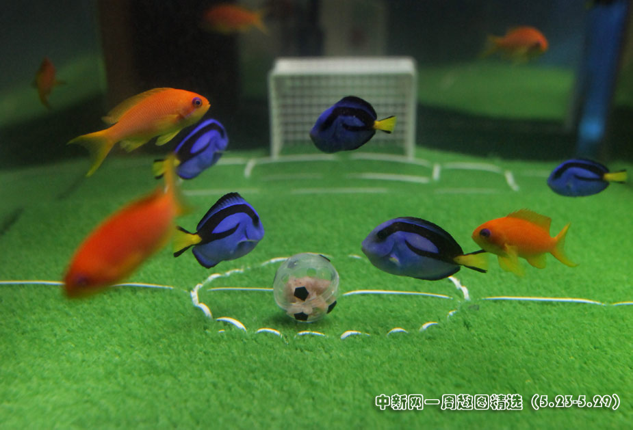 5月23日,日本橫濱八景島海洋世界水族館中,一群魚兒在“踢足球”,藍色魚代表日本隊,橘色魚代表荷蘭隊。在2010年南非“世界杯”上,日本將迎戰(zhàn)荷蘭隊。 圖片來源:中國新聞網(wǎng)>>點擊觀看詳細內(nèi)容