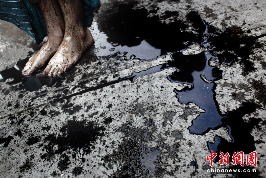 5月28日,美國環(huán)保主義者在紐約曼哈頓的一家加油站前,身上涂灑黑色顏料,以此抗議墨西哥灣原油不斷泄露。