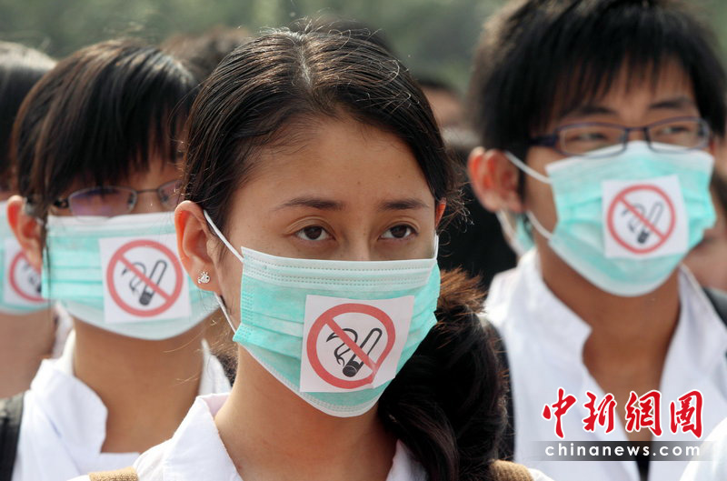 5月31日是第23個(gè)“世界無(wú)煙日”,今年的主題是:性別與煙草——抵制針對(duì)女性的市場(chǎng)營(yíng)銷。吸煙有害健康早已成為不爭(zhēng)的事實(shí)。有關(guān)醫(yī)學(xué)研究表明,吸煙可導(dǎo)致心腦血管疾病、癌癥、慢性阻塞性肺病等多種疾病,已成為繼高血壓之后的全球第二號(hào)殺手。為了您的健康,請(qǐng)熄滅您手中的香煙。圖為5月29日西安大學(xué)生戴著無(wú)煙口罩開展控?zé)熜袆?dòng)。袁景智 攝