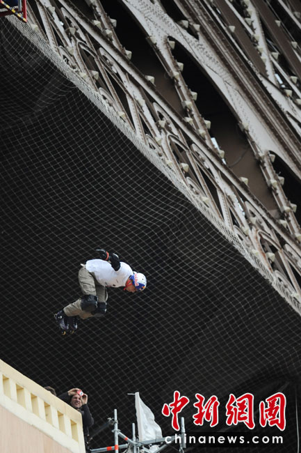 5月29日,法國巴黎,法國極限直排輪冠軍克里斯(Taig Khris)從法國艾菲爾鐵塔跳下,創(chuàng)下世界新自由落體紀(jì)錄。