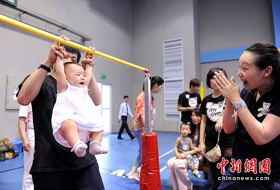 5月29日上午,北京,300多個六歲以下的寶寶在樂成國際學(xué)校參加六一歡動會活動。圖為寶寶在老師的輔助下完成超級單杠。歐陽曉菲/CFP