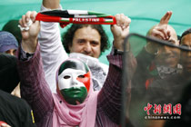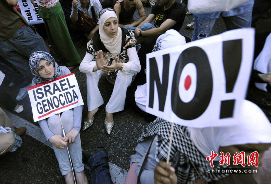 以色列海軍31日對國際人道救援船隊發(fā)動襲擊,船上至少有9名支持巴勒斯坦的活動人士被以軍打死,眾多國家和國際組織紛紛表示“震驚”,多國民眾走上街頭,對襲擊事件表示抗議。圖為在西班牙馬德里,民眾在街頭游行抗議。
