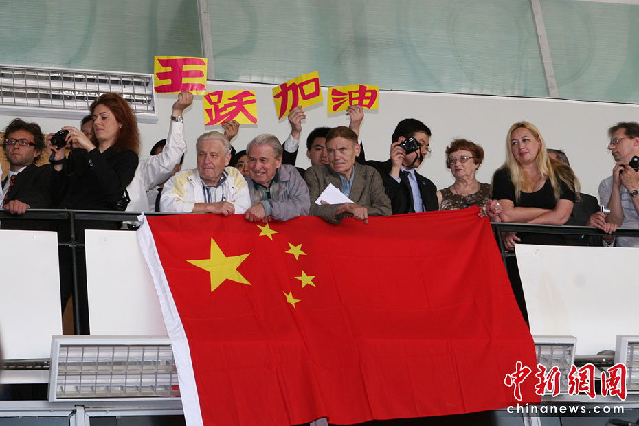 當?shù)貢r間6月3日14時,“火星-500”實驗艙最后一道艙門關(guān)閉,人類歷史上首次模擬火星載人航天飛行試驗就此拉開帷幕。中國參試項目團隊現(xiàn)場為王躍加油。中新社記者 田冰 攝
