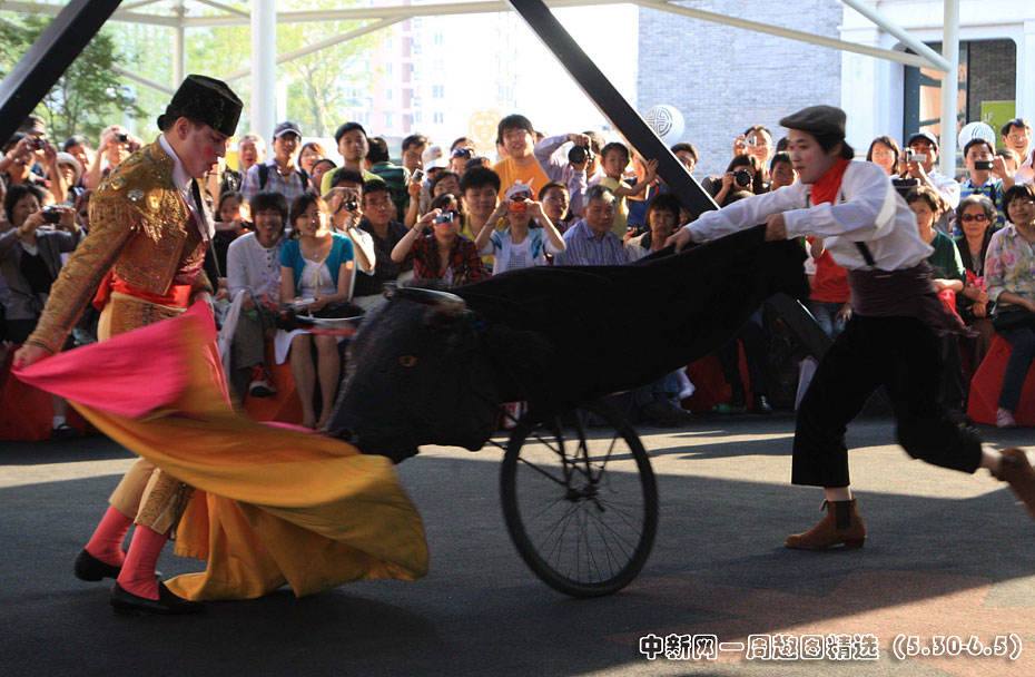 新近,上海世博園區(qū)里的各種趣味演出連連,西班牙斗牛士與一頭假公牛相互角逐,讓眾多游客樂開懷。圖片來源:中國新聞網(wǎng)>>點擊觀看詳細(xì)內(nèi)容