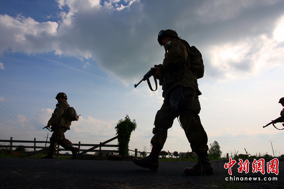 6月5日,諾曼底登陸66周年前夕,一批演員身著二戰(zhàn)時(shí)期美軍軍服,在法國(guó)諾曼底卡倫坦重現(xiàn)了這次著名的戰(zhàn)役。
